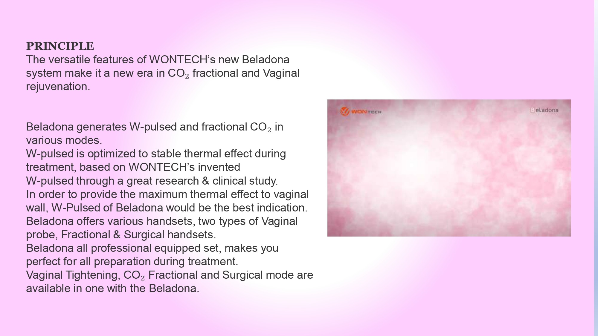 إن الميزات المتعددة التي يتمتع بها نظام Beladona الجديد من WONTECH تجعله عصرًا جديدًا في تجديد المهبل باستخدام ثاني أكسيد الكربون الجزئي.
